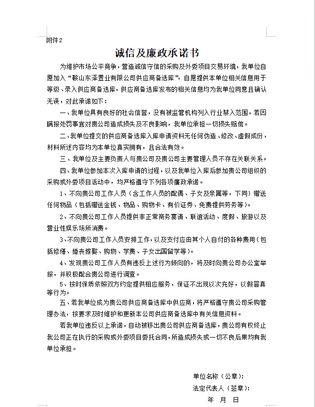 1.請(qǐng)有意向的企業(yè)按要求填寫《供應(yīng)商入庫(kù)登記備案信息表》(見(jiàn)附件1)和《供應(yīng)商誠(chéng)信承諾書》(見(jiàn)附件2)。請(qǐng)將填寫完畢并加蓋公章的上述資料掃描件,以及營(yíng)業(yè)執(zhí)照的掃描件,發(fā)送至指定郵箱asdc2017@163.com。同時(shí),企業(yè)也可選擇將蓋章的紙質(zhì)版資料和營(yíng)業(yè)執(zhí)照復(fù)印件(同樣需加蓋公章)送至鞍山市鐵東區(qū)建國(guó)大道21號(hào)206辦公室。如有任何疑問(wèn)或需要協(xié)助,請(qǐng)撥打聯(lián)系電話:15141215535。